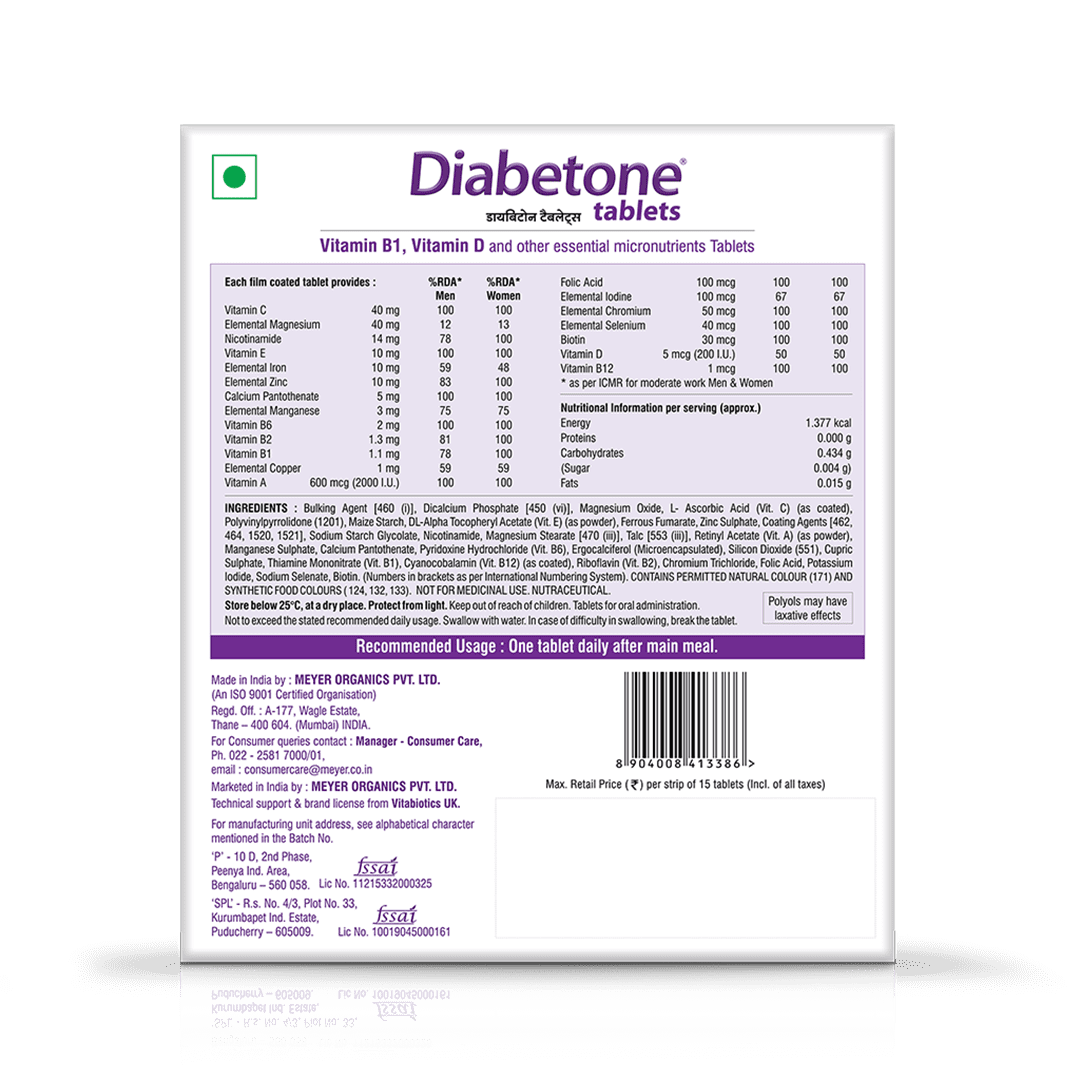 Diabetone tablets are a combination of essential vitamins and minerals that play a crucial role in diabetes management by supporting overall health and addressing specific concerns related to the condition. B-complex vitamins aid in carbohydrate metabolism and nerve function.