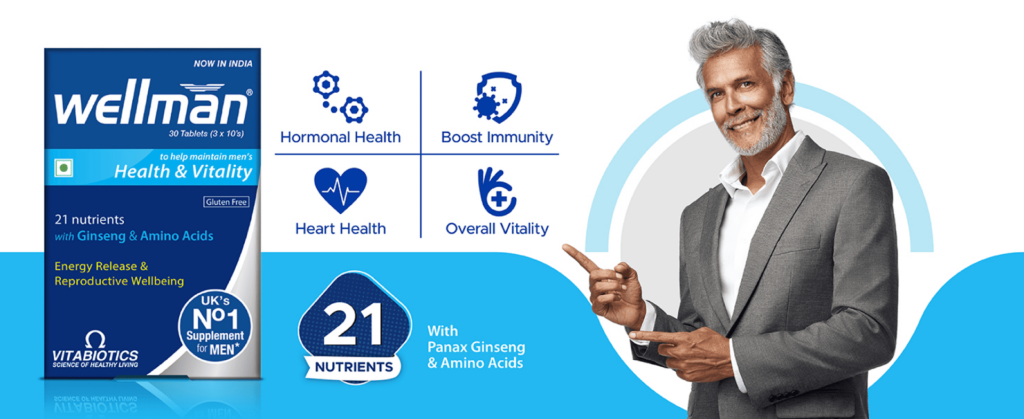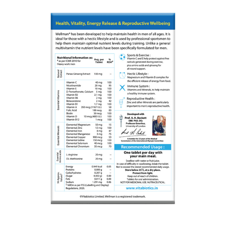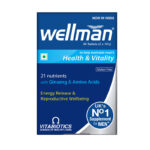Wellman is our flagship multivitamin with 21 essential vitamins and minerals specially developed for men to help maintain overall health and vitality. Also it includes Ginseng and amino acids like L-Arginine that boosts energy release and reduces fatigue.
