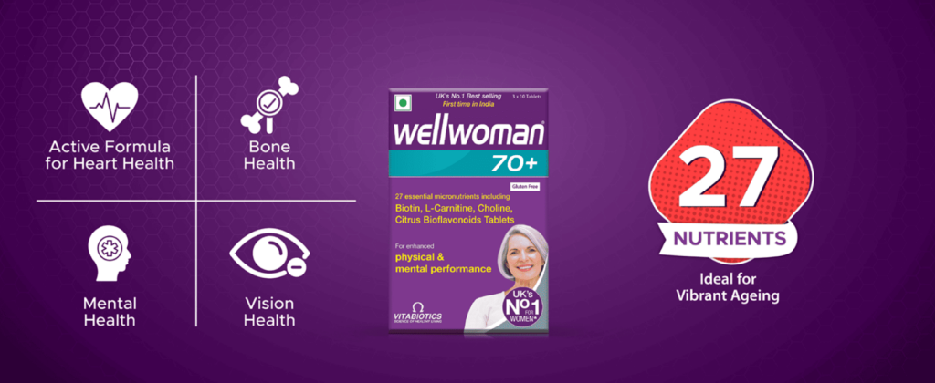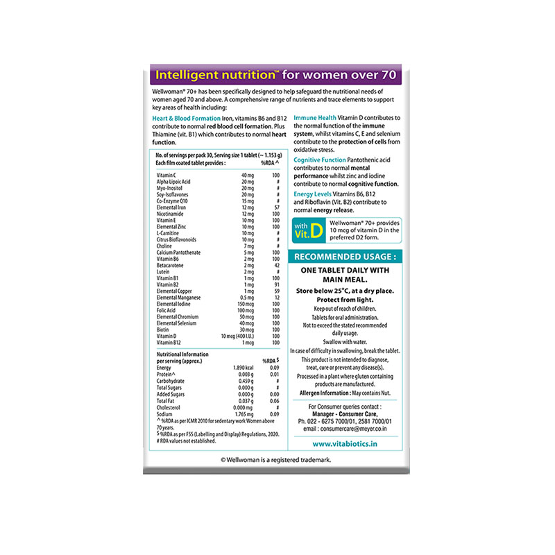 Wellwoman 70+ provides a comprehensive blend of 27 essential multivitamins and vitamins tailored to the specific needs of older women.Â